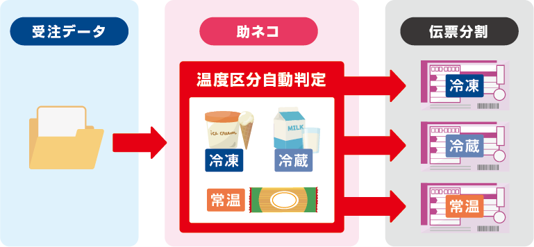 たとえば、常温と冷凍の商品を同じ注文で受けた場合でも、自動で伝票を分けて出荷準備ができます。