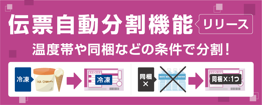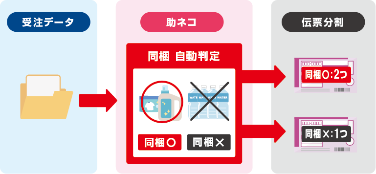 異なる温度帯の商品、同梱不可商品が1注文に混在していたら助ネコが自動で伝票分割を行います。